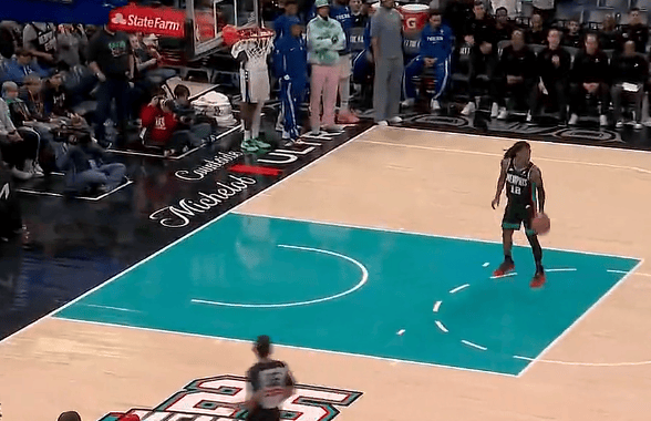 比赛的加时赛,莫兰特抢断反击到前场,故意停球看向76人球员随后上篮。